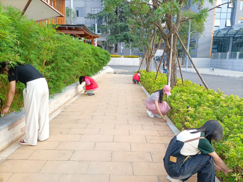 志愿者们在智华广场、经管楼、致知楼以及西门等周边区域进行细致打扫,大家不怕脏,不怕累,扫去地面尘土,捡拾绿化带垃圾、拔除杂草等,忙得不亦乐乎。