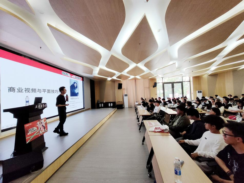 本次活动设置了氛围人像拍摄体验区,VR系统体验区和照片打印区。到场师生沉浸式体验了现场最新影像产品的使用效果。商业广告摄影师何若诗为艺术与设计学院(艺术博物馆)学生带来题为《商业视频与平面技巧》的讲座。何若诗结合商业广告案例,分享了广告摄影和视频制作的工作思路与操作流程,重点讲解了客户沟通、前期准备、脚本制作、视频结构及镜头演员调度等内容,鼓励同学们在日常生活中养成搜集美的习惯,建构属于自己的素材库。