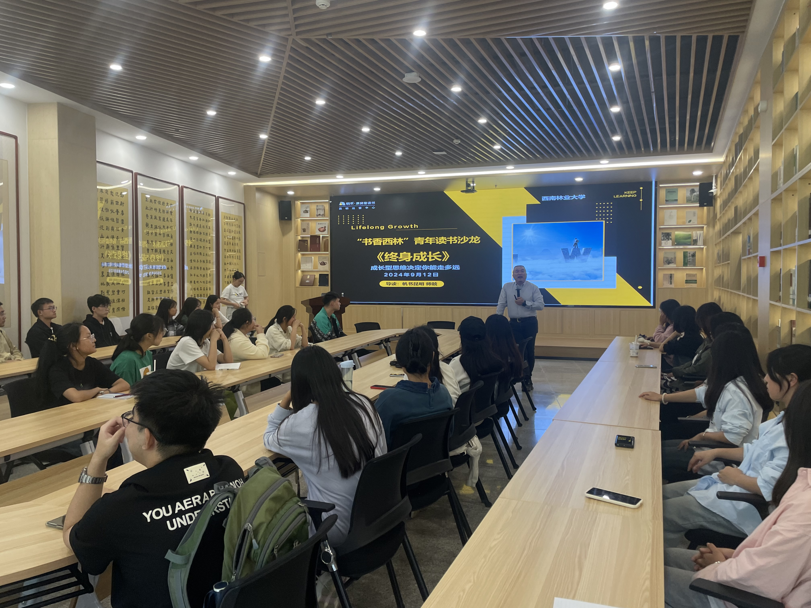 9月12日,图书馆、校团委在世界茶叶图书馆会议室联合举办以“终身成长”为主题的“书香西林”青年读书沙龙活动。讲座邀请帆书(前樊登读书)签约讲师、春城百姓宣讲团成员师兢老师主讲。