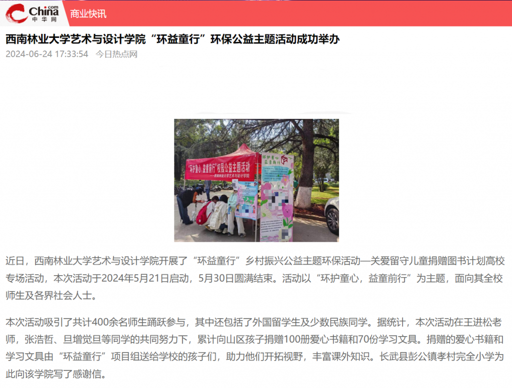 6月24日,“中华网”报道了艺术与设计学院(艺术博物馆)开展的“环益童行”乡村振兴公益主题环保—关爱留守儿童捐赠图书计划高校专场活动,引发热烈反响。