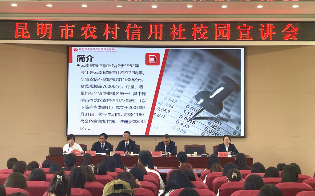 会上,昆明市联社党委书记、理事长李振华介绍农信社基本情况;昆明市联社党委组织部副部长张建荣介绍农信社员工福利保障和招聘情况;盘龙区联社党委书记、理事长张倩介绍创业担保贷款产品以及电信诈骗的十种类型,提醒学生预防电信诈骗,注重个人征信的保护。两名在昆明市农村信用社工作的经济管理学院校友交流在农信社工作和生活体会,分享备考经验和感受,鼓励师弟师妹们积极备考。
