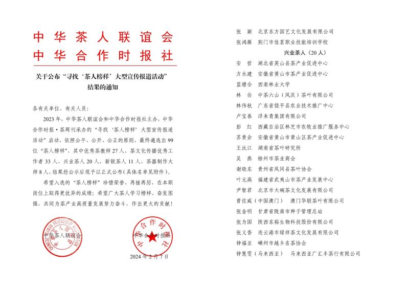 “茶人榜样”是中国茶产业的领军人物、领先人才,由中华茶人联谊会、中华合作时报社主办,旨在挖掘和表彰在茶文化、茶产业领域做出杰出贡献的茶人,通过树立榜样,引领和推动茶文化的传承与创新。(来源:经济管理学院/文/图:陶燕蓝/审核:张连刚/初审:史桓恺/复审:矣学忠/终审:柏顺文/责任编辑:矣学忠)