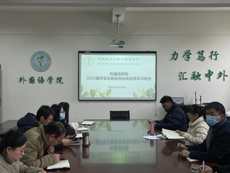 12月26日,外国语学院组织召开2023届毕业生就业创业去向落实冲刺会。会议由学院党委书记姜丽红主持,院长何新元、副院长饶耀平、党委副书记李法营、各专业负责人及全体2023届毕业生班主任参会。