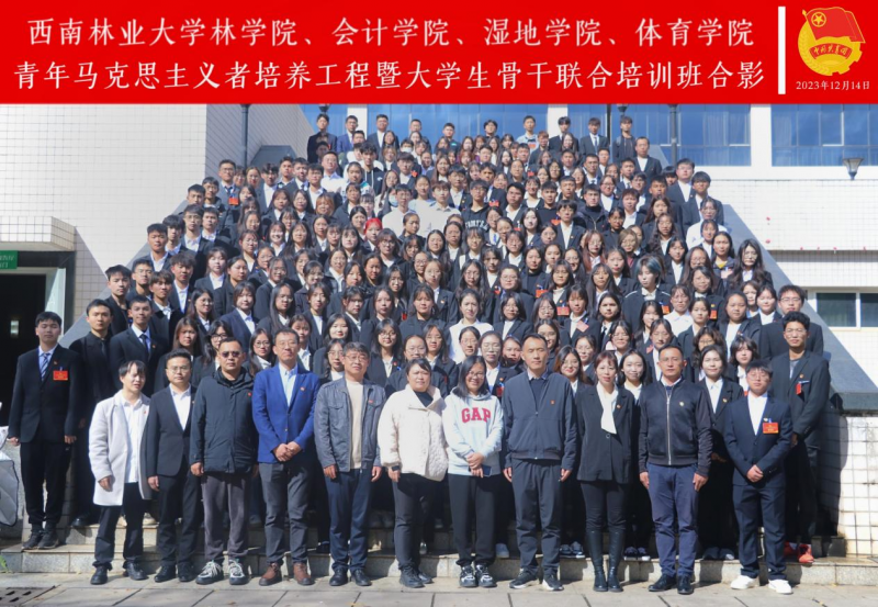 12月14日,学校林学院、会计学院、体育学院、湿地学院和生物多样性保护学院在图书馆小报告厅联合举行“青马工程”大学生骨干培训班开班仪式。生物多样性保护学院党委副书记唐甜甜、湿地学院党委副书记孙大成、会计学院党委副书记赵芬、体育学院党委副书记陈涛以及各家学院团委负责人、208名青马学员参加开班仪式。会计学院团委负责人李楠主持开班仪式。