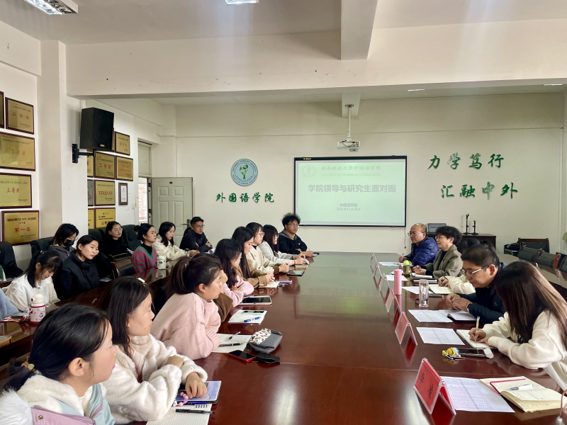 为及时掌握研究生同学的学习、生活情况,更好地做好研究生培养工作,外国语学院于11月30日开展“学院领导与研究生同学面对面”活动。学院党委书记姜丽红、党委副书记李法营、学院特聘教授李秀梅、教学和团学相关老师,以及2023级全体在校研究生参会。