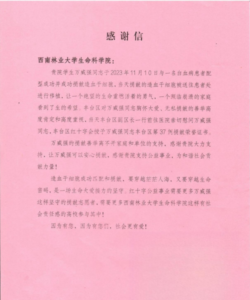 近日,生命科学学院万威强同学在北京丰台区完成造血干细胞捐献,成为中华骨髓库第16379例配型成功并完成造血干细胞捐献的志愿者。