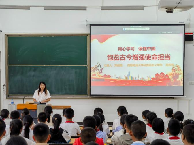 邓成琼带领同学们从“中国的非凡成就”“坚持党的领导是中国制胜的传家宝”“中国共产党的人民情怀”“中国的大国担当”“中国众志成城的伟大民族精神”5个方面来读懂中国,让同学们认识和感悟新时代中国的伟大成就,并勉励西林附中学子要从小树立远大理想、胸怀报国之志,学好科学文化知识、强健体魄,为实现中华民族伟大复兴而努力奋斗。