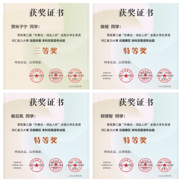 近日,米兰法学专业的贾林子宁同学在2023年“外教社•词达人杯”全国大学生英语词汇能力大赛中获得全国决赛三等奖,另有来自不同专业的24名同学分别获得省级特等奖、一、二、三等奖,指导老师获指导奖。