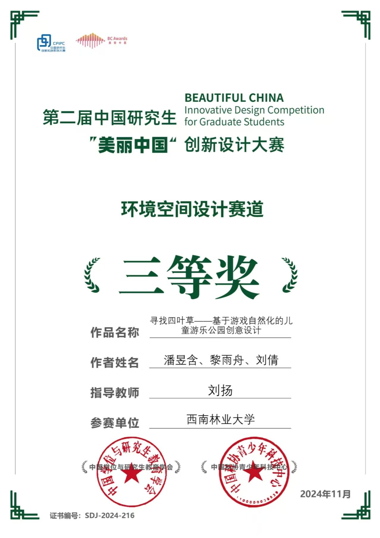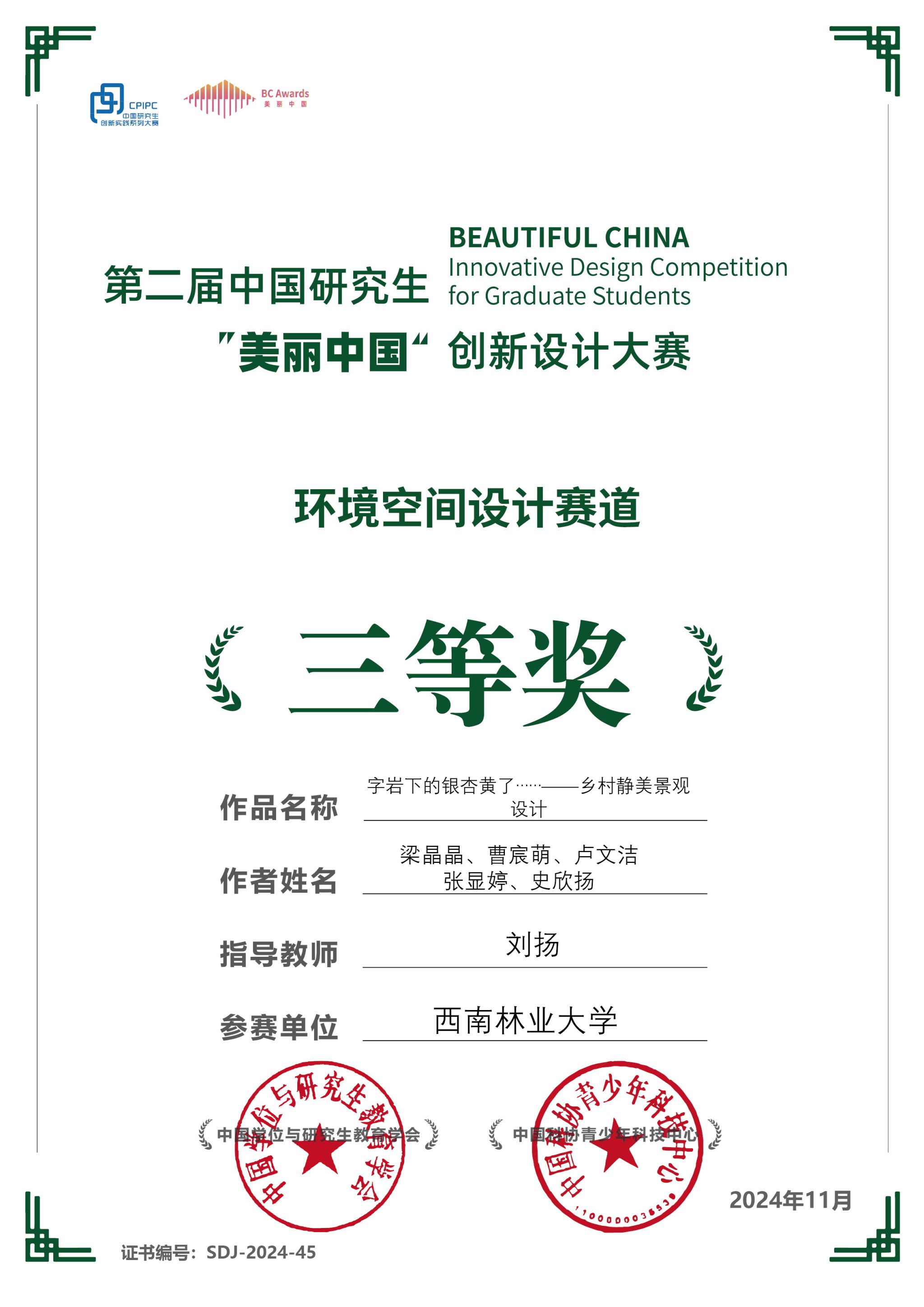 近日,第二届中国研究生“美丽中国”创新设计大赛落下帷幕。米兰园林园艺学院刘扬教授指导学生梁晶晶、曹宸萌、卢文杰、张显婷、史欣扬的参赛作品《字岩下的银杏黄了——乡村静美景观设计》以及潘昱含、黎雨舟、刘倩的参赛作品《寻找四叶草——基于游戏自然化的儿童游乐公园创意设计》,分别在乡村空间改造国赛、城市人居环境设计国赛中均荣获三等奖。