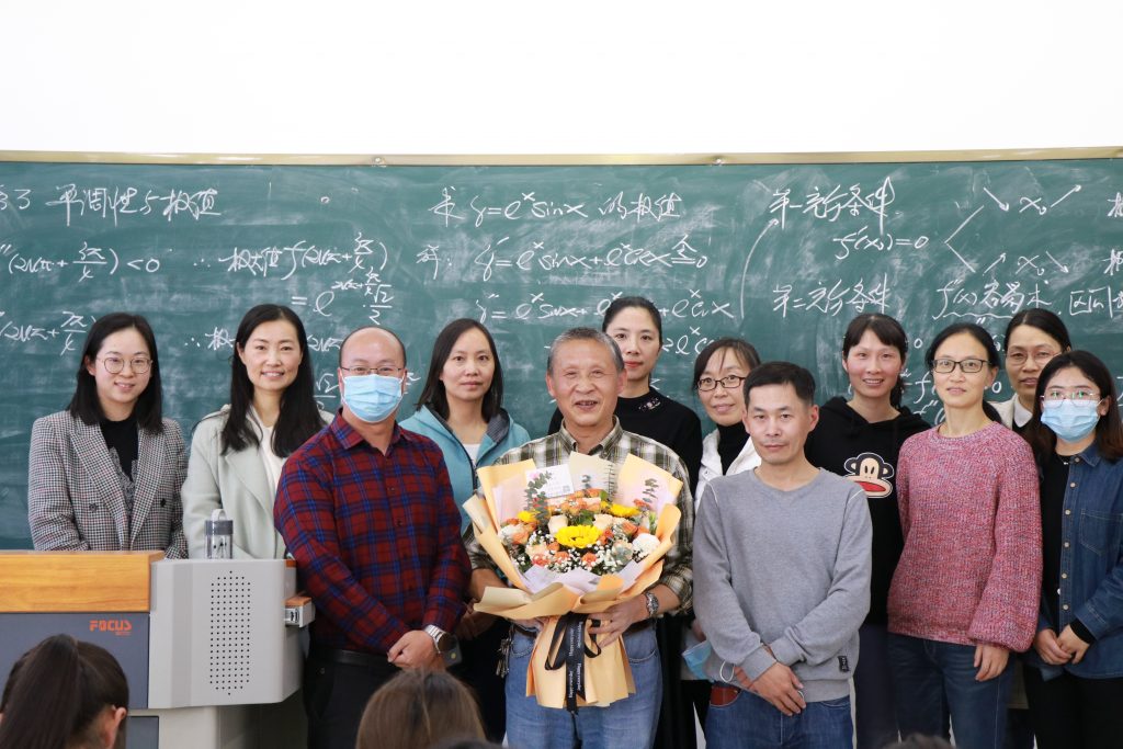 黄斌在西林讲台耕耘34年,积累了丰富的教学经验,如今退而不休依然坚守教学一线。黄斌结合学科特点,为师生讲述了单调性与极值、凹凸性与拐点、函数图形的绘制等内容。教师代表潘立作听课感想发言,青年教师代表张鸿雁向黄斌献上鲜花,副院长李谦代表学院对黄斌表示感谢和祝福,并表达传承西林老一辈教师优秀教风的决心。