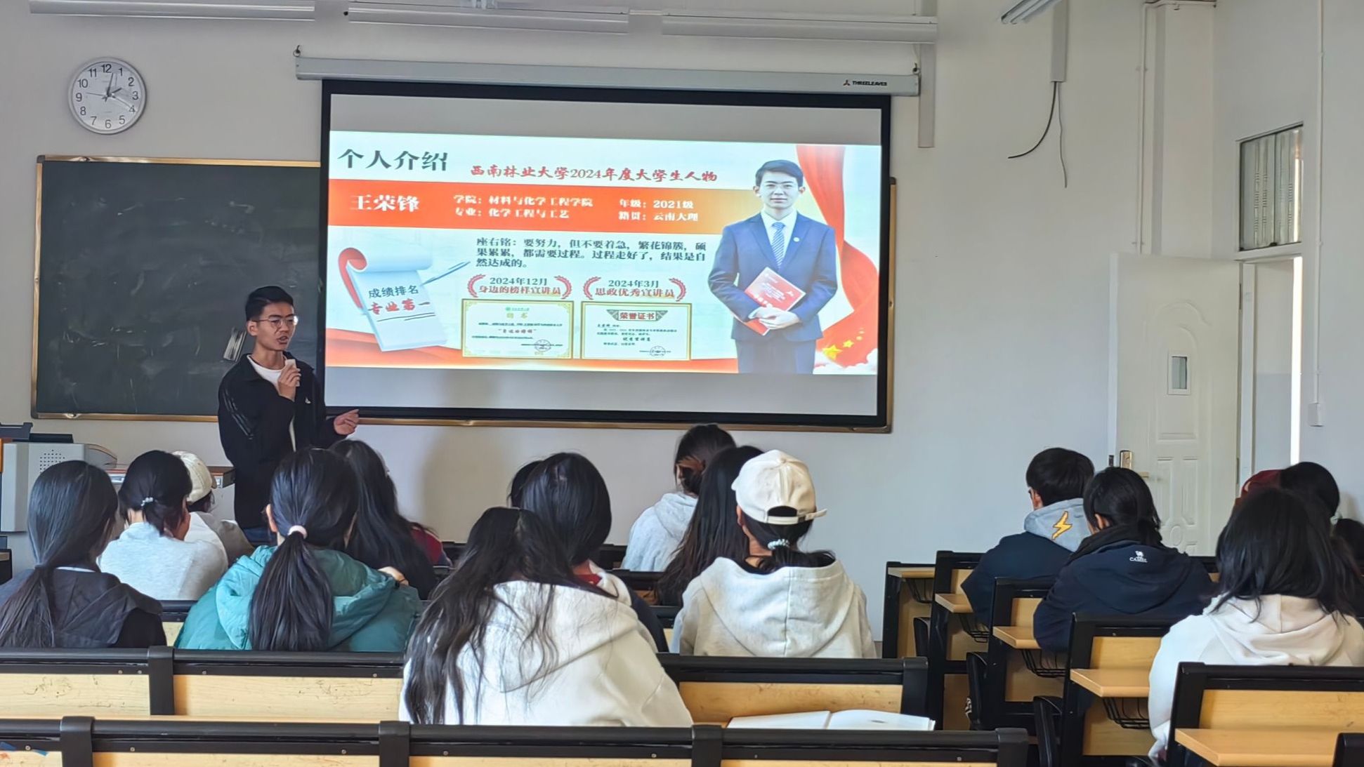 12月24日 ,“身边的榜样”宣讲团成员、校大学生年度人物王荣锋、张红玲走进“一站式”学生社区第二片区相关班级开展朋辈宣讲活动。