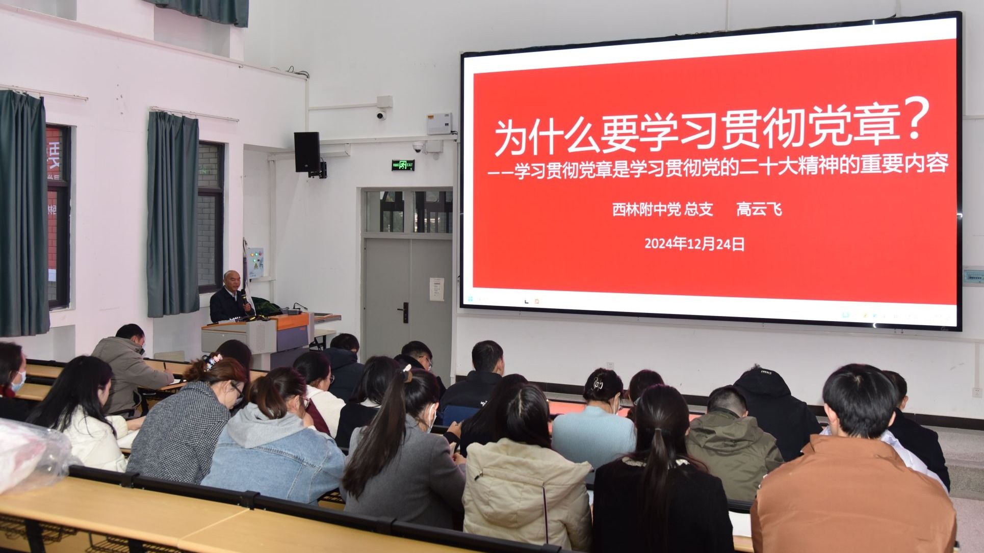西林附中党总支书记高云飞作《为什么要学习贯彻党章?——学习贯彻党章是学习贯彻党的二十大精神的重要内容》的专题讲座。高云飞表示,党员要深学党章要义,在学深悟透中践行初心使命,把学习党章精神同学习贯彻习近平新时代中国特色社会主义思想结合起来,进一步遵守党章、贯彻党章、维护党章。