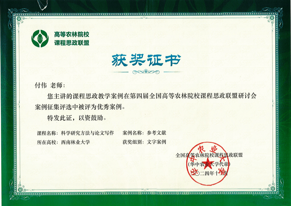12月21日,由全国高等农林院校课程思政联盟主办,长江大学承办的第四届全国高等农林院校课程思政建设研讨会在湖北荆州召开。会上颁发了课程思政优秀教学案例奖。我院付伟老师申报的《科学研究方法与论文写作》荣获优秀文字案例奖。