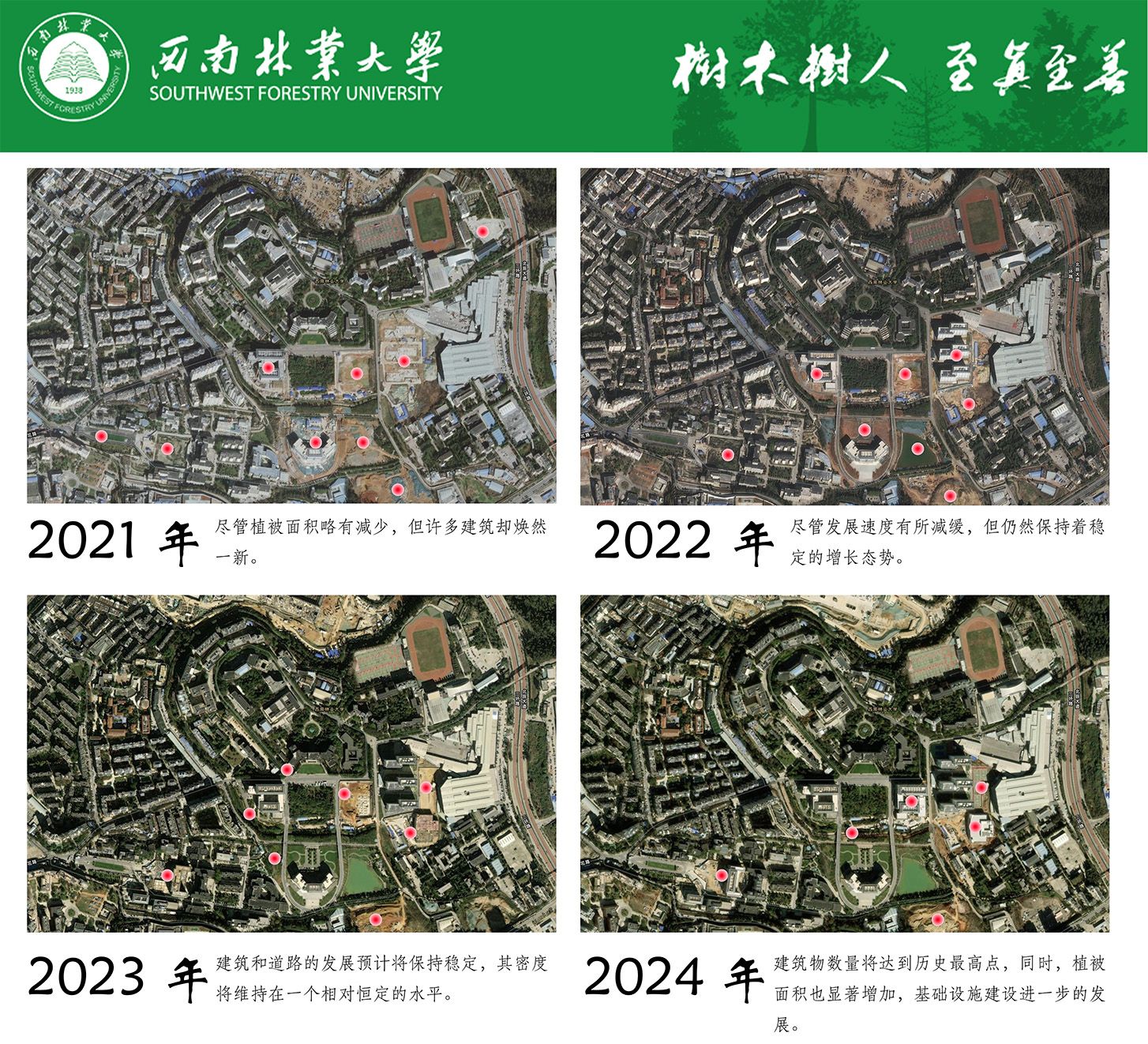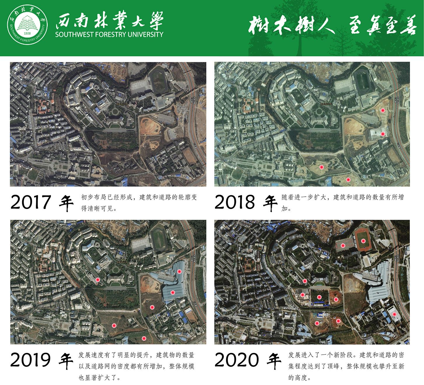 二等奖作品《回望十年之变-共绘西林宏图》由闫钰昆、杨刚、杨佳琪三位同学在展鹏飞老师指导下创作完成,展现了学校十年来的变迁与发展,以及学子们对校园的深情厚意。三等奖作品《时光地图·我们的校园故事》是一件借助遥感技术的组图作品,由李平光、冯明智、刘景洪、宁科正、于淼五位同学在徐洋老师的指导下创作,展现了美丽的校园风光;《探秘西林——寻“亭”觅“馆”》,由毕正芳、郝培文、李诗琪、吕思婷四位同学在展鹏飞老师的指导下完成。作品带领观众探秘校园中的亭台楼阁,展现了学校独特的自然景观和人文景观。