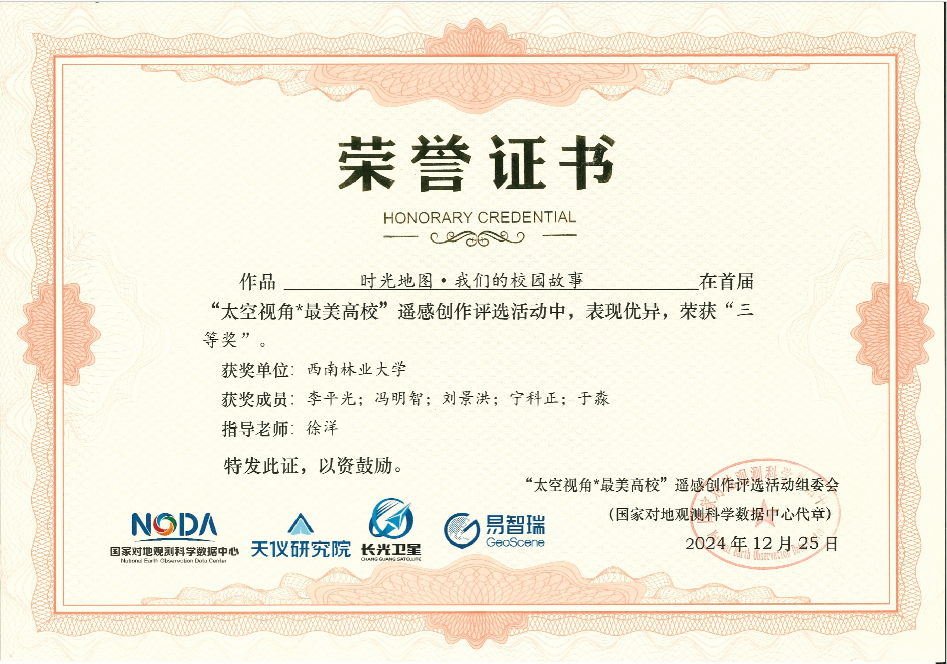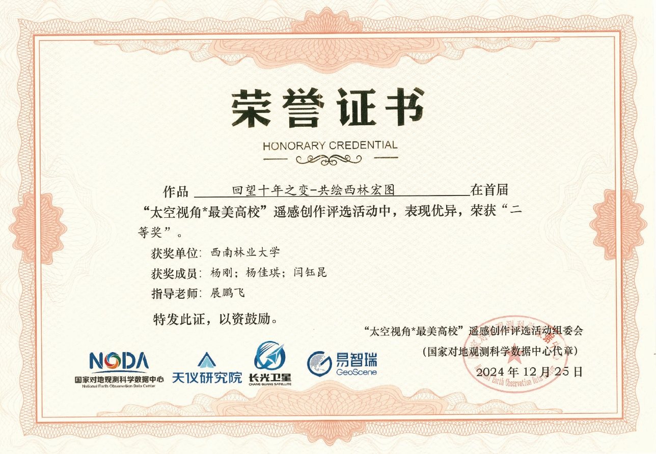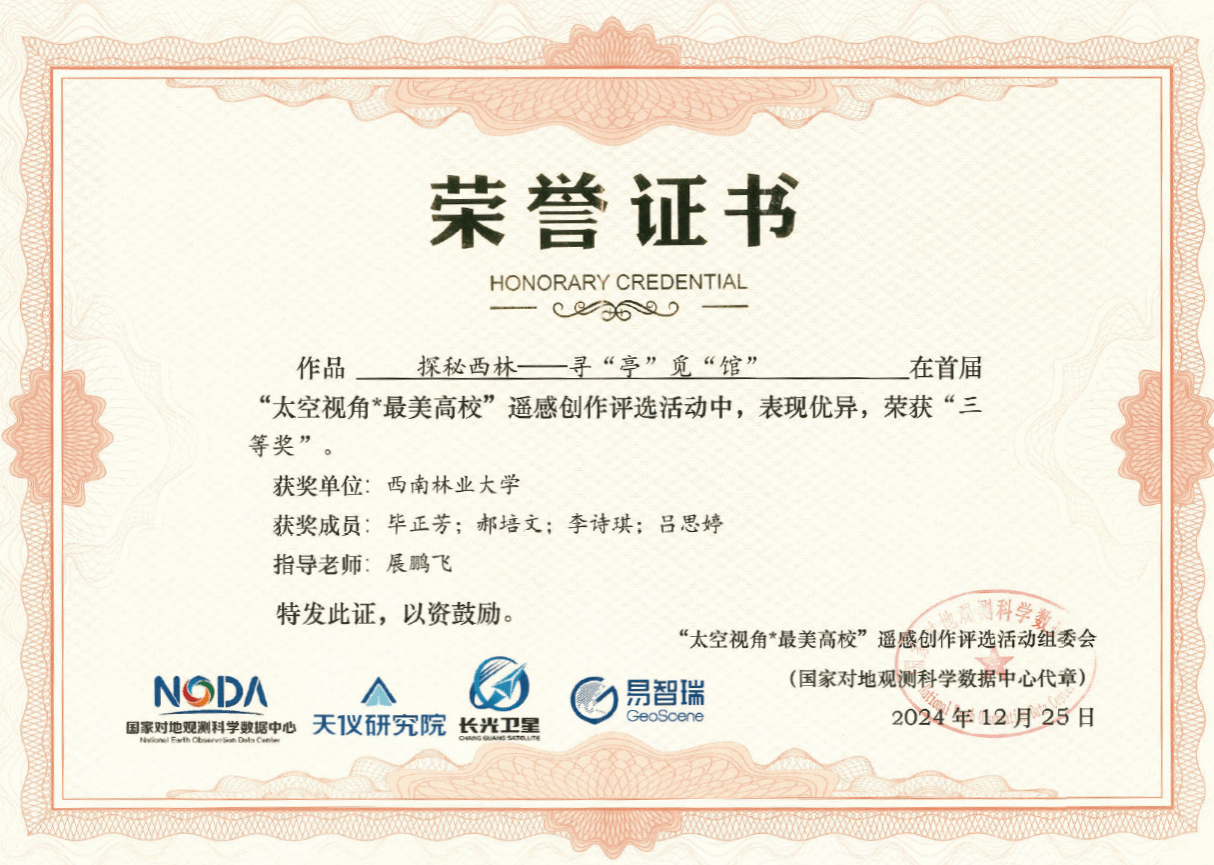 在近日揭晓的“太空视角·最美高校”遥感创作评选活动中,生态与环境学院(湿地学院)生态学与环境科学2024级学生表现优异,分别获得1项二等奖和2项三等奖的优异成绩。