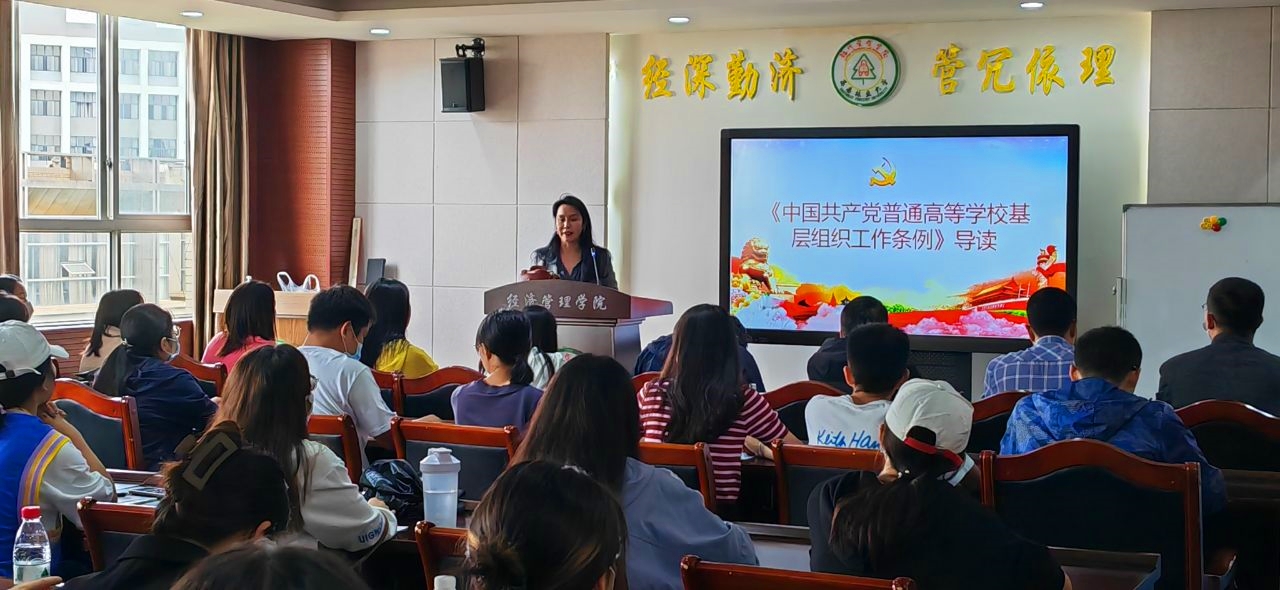 本次党课以《中国共产党普通高等学校基层组织工作条例》为题,结合学校下发的“西林党通[2022]11号”通知要求,胡晓联系学院工作实际,围绕新修订的《中国共产党普通高等学校基层组织工作条例》,对其主要内容进行了解读。