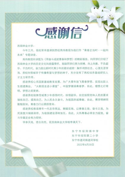 今年三月,高伟同志应邀参加黑龙江省东宁市“青春正当时 ·一起向未来”公益讲座,为东宁市绥阳镇中学、东宁市绥阳第二小学和东宁市道河镇道河学校师生三百余人作《用奋斗成就青春和梦想》的精彩报告,向师生们介绍了米兰milan官方网站的历史文化、底蕴情怀、木材科学发展前沿和高伟教授团队最新科研成果,结合中小学生学习特点开展了细致讲解,鼓励同学们努力拼搏、向上向善、不负韶华、不负时代,奋力跑出新时代青少年的最好成绩。报告得到了在线师生的一致好评,上述三所学校也于近日向米兰milan官方网站寄来了感谢信。