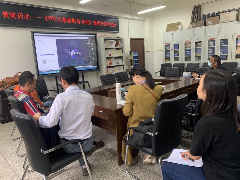 教研活动邀请了北京融智国创科技有限公司的老师,介绍了基于VDC平台的《大数据财务分析》、《大数据财务分析与决策》、《大数据审计》等课程模块情况,分别从VDC平台的教师端和学生端的具体功能和使用方法进行了介绍,并从数据的抓取、数据的分析和结果的可视化呈现等方面进行详细的实操演示。在此基础上,双方就课程主要性质、解决的主要问题、数据库的更新、如何与新版人才培养方案对接等方面进行了深入的交流。