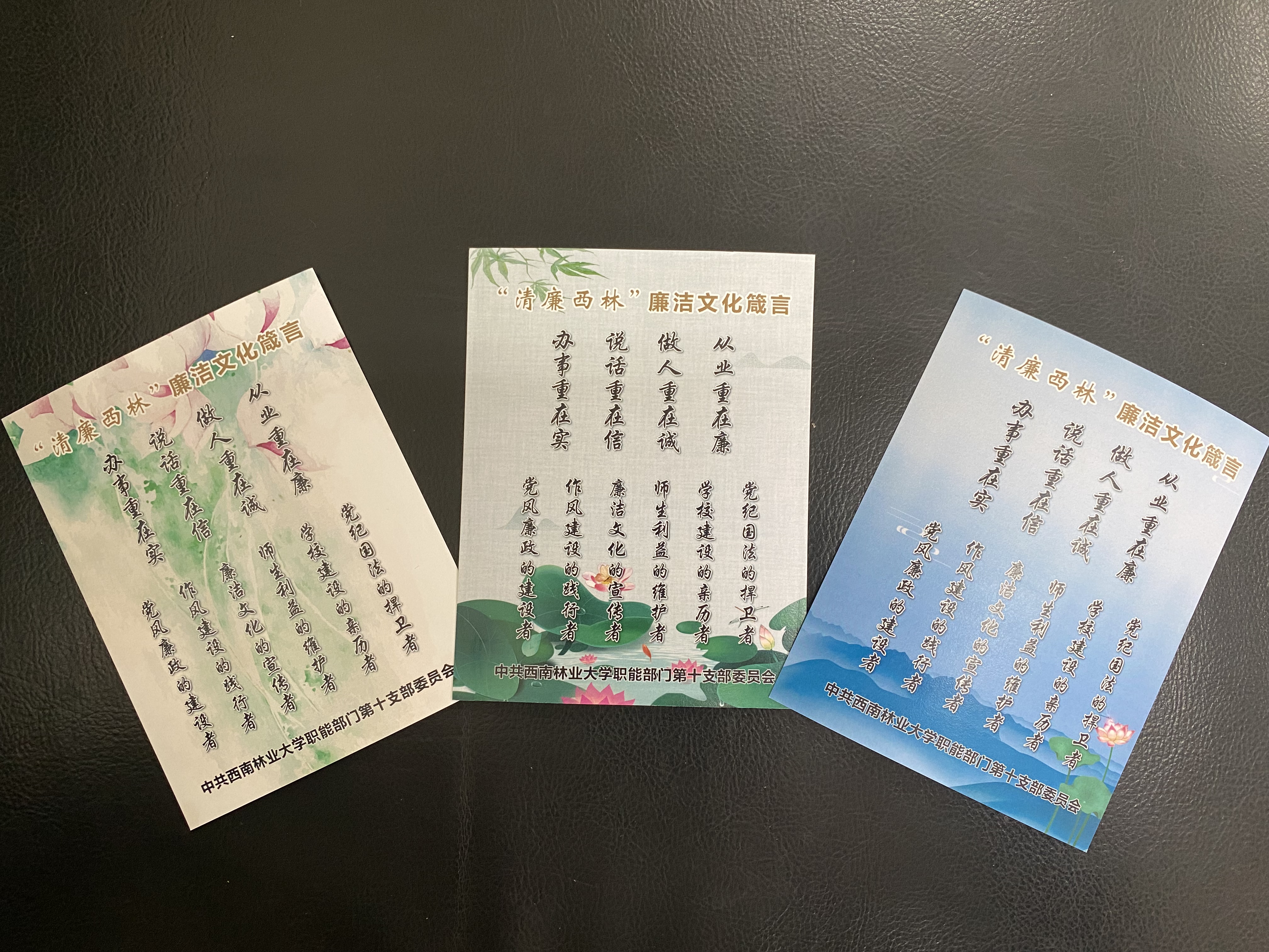 为落实落细“清廉西林”建设活动要求,不断丰富文化周活动内容,职能部门党委第十支部向全体党员干部群众制作廉洁文化箴言卡,以“四重”“六者” 提倡廉洁自律,秉公办事,不徇私情,不谋私利,为民服务,清白做人的精神。这是支部推进“清廉西林”建设文化周活动和廉洁风险防控工作,确保党员干部随时学习、处处对照、警钟长鸣推出的又一“新招”。