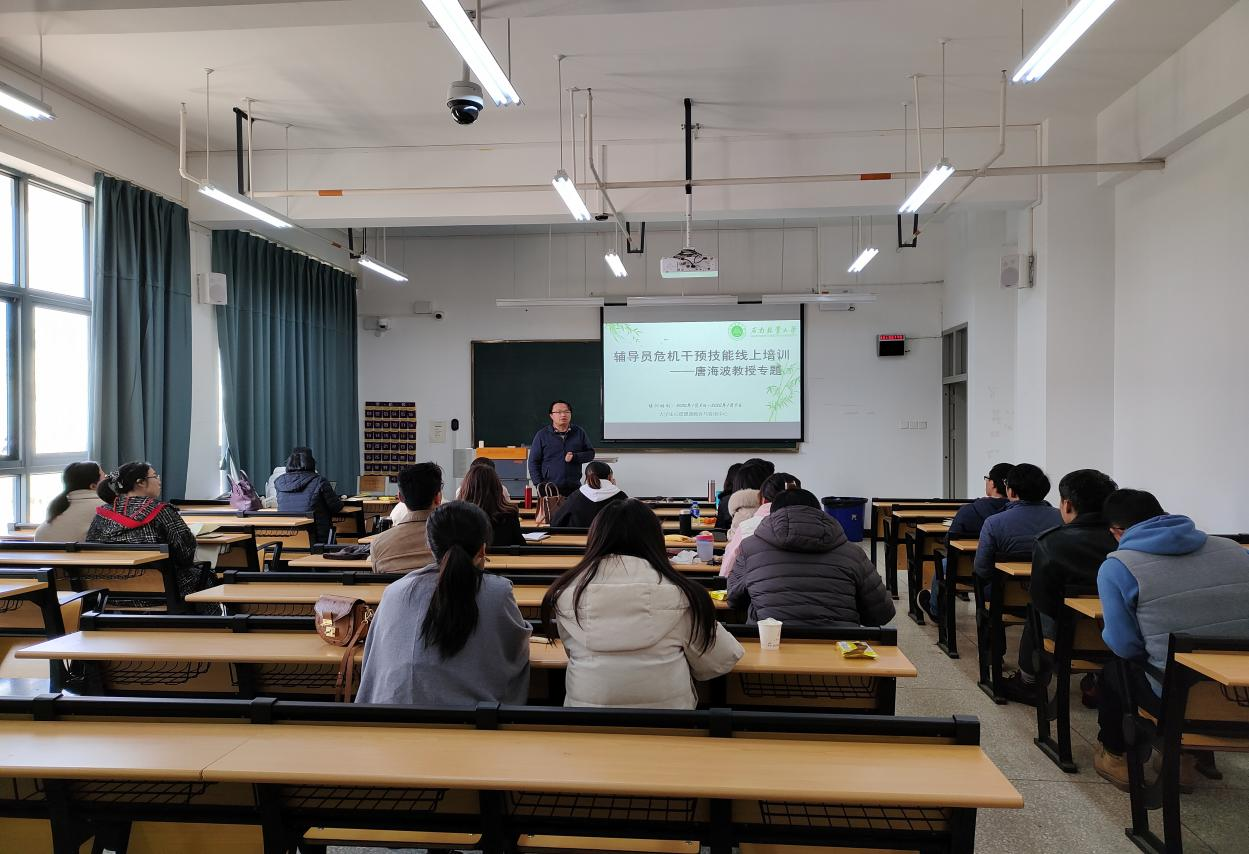为深入贯彻落实《教育部办公厅关于加强学生心理健康管理工作的通知》,着力提升米兰辅导员开展心理健康教育工作的能力,进一步提高学生心理健康教育工作的针对性、实效性,加强辅导员心理健康教育基本知识和技能,1月8日—9日,学生处组织米兰辅导员参加心理危机干预技能线上集中培训,授课教师为中南大学心理咨询中心咨询专家、精神科执业医师、中南大学湘雅三医院应用心理学硕士生导师唐海波。