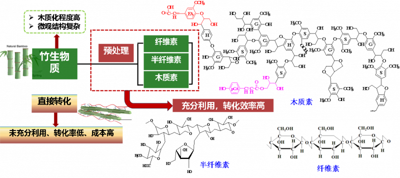 木质纤维生物质绿色分离及全值化利用创新团队在研究木竹材细胞壁主要化学成分的分布规律、结构特征以及组分间特殊化学键合机制的基础之上,主要围绕木竹纤维生物质细胞壁组分结构的绿色有序拆分,以及分离全组分的功能化利用领域开展系统研究,主要研究内容为(1)木质纤维生物质细胞壁组分结构的绿色有序拆分技术;(2)木质纤维生物质生物及化学转化构建高效糖平台;(3)木竹基先进功能性材料的制备技术,形成了一套以云南特色生物质资源制备糖基化合物、燃料乙醇、半纤维素和木质素衍生物、纤维复合材料、浆纸等工业产品的集成技术,其研究成果对推动绿色经济、循环产业的木竹材新工业加工体系的发展具有重要意义。