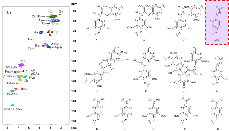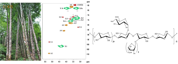 滇产丛生竹木质素主要联接键为β-O-4‘醚键,其次是β-β’、β-1′和β-5‘结构,大分子结构中存在苜蓿素结构片段,侧链γ位碳与对香豆酸存在化学键联接,形成对香豆酸酯;② 竹材半纤维素主链是(β-1→4)-聚木糖,侧链为α-L-阿拉伯糖和/或4-O-甲基-D-葡萄糖醛酸,侧链通过α-(1→3)和/或α-(1→2)方式连接到分子主链上。