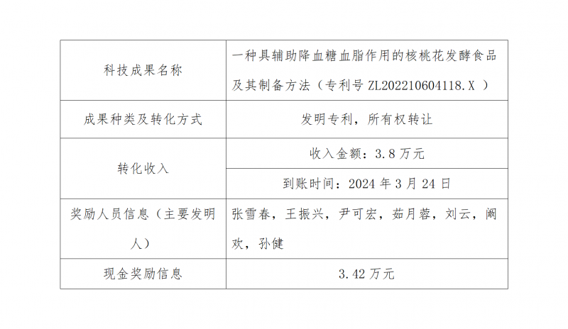 根据《财政部税务总局科技部关于科技人员取得职务科技成果转化现金奖励有关个人所得税政策的通知》(财税〔2018〕58号)、《科技部 财政部 税务总局关于科技人员取得职务科技成果转化现金奖励信息公示办法的通知》(国科发政〔2018〕103号)、《米兰milan官方网站科技成果转化管理暂行办法》(西南林〔2018〕175号)的相关规定,现对如下科技成果转化现金奖励分配方案进行公示。公示15个工作日(2024年3月27日—4月10日),公示期内,若任何单位或者个人对公示内容存在异议,请以书面实名形式向米兰milan官方网站科技处反映。