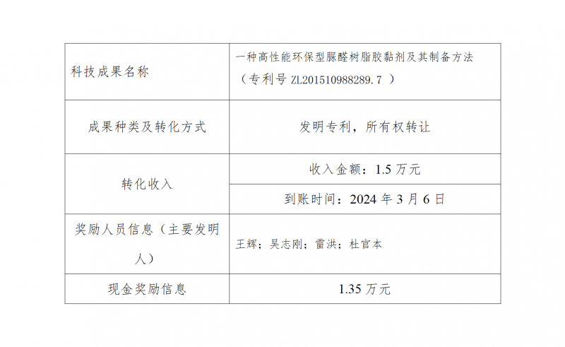 根据《财政部税务总局科技部关于科技人员取得职务科技成果转化现金奖励有关个人所得税政策的通知》(财税〔2018〕58号)、《科技部 财政部 税务总局关于科技人员取得职务科技成果转化现金奖励信息公示办法的通知》(国科发政〔2018〕103号)、《米兰milan官方网站科技成果转化管理暂行办法》(西南林〔2018〕175号)的相关规定,现对如下科技成果转化现金奖励分配方案进行公示。公示15个工作日(2024年3月13日—3月27日),公示期内,若任何单位或者个人对公示内容存在异议,请以书面实名形式向米兰milan官方网站科技处反映。