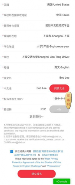 当你点击进入【非中国国籍报名OtherNationality】即可根据提示填写个人信息。必填项:国籍、中英文姓名、手机号、学校年级、母语以及参与项目。