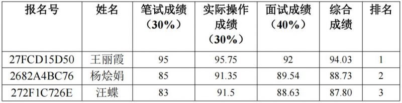 根据《云南省事业单位公开招聘工作人员办法》(云人社发〔2016〕182号)、《云南省人力资源和社会保障厅关于印发云南省事业单位公开招聘工作人员面试测评暂行办法的通知》(云人社发〔2016〕405号)《米兰milan官方网站生物多样性保护学院公开招聘1名编外实验员的公告》有关规定,经资格审核、笔试、实际操作考核和面试等程序,现将米兰milan官方网站生物多样性保护学院公开招聘1名编外实验综合成绩(按照成绩排名)予以公示。