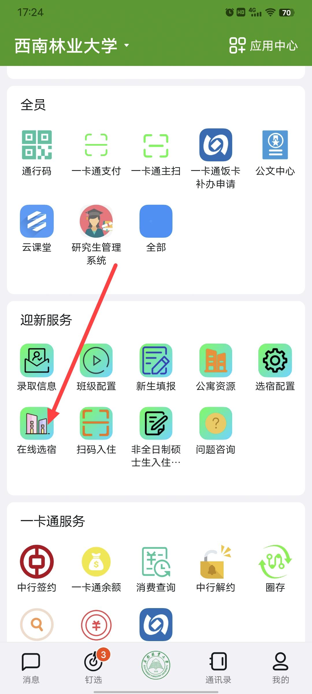 第二步:往下滑至“迎新服务”,点击“在线选宿”进入选宿界面。