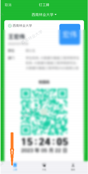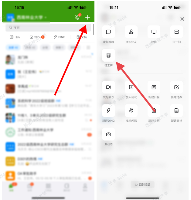 扫码入住操作指南:到达所选楼栋,打开手机钉钉,点击右上方的加号,选择“钉工牌”,出现图下所示二维码,将二维码出示给宿舍管理员扫码确认后领取宿舍钥匙方可入住。