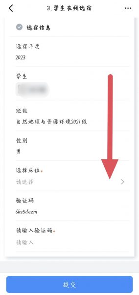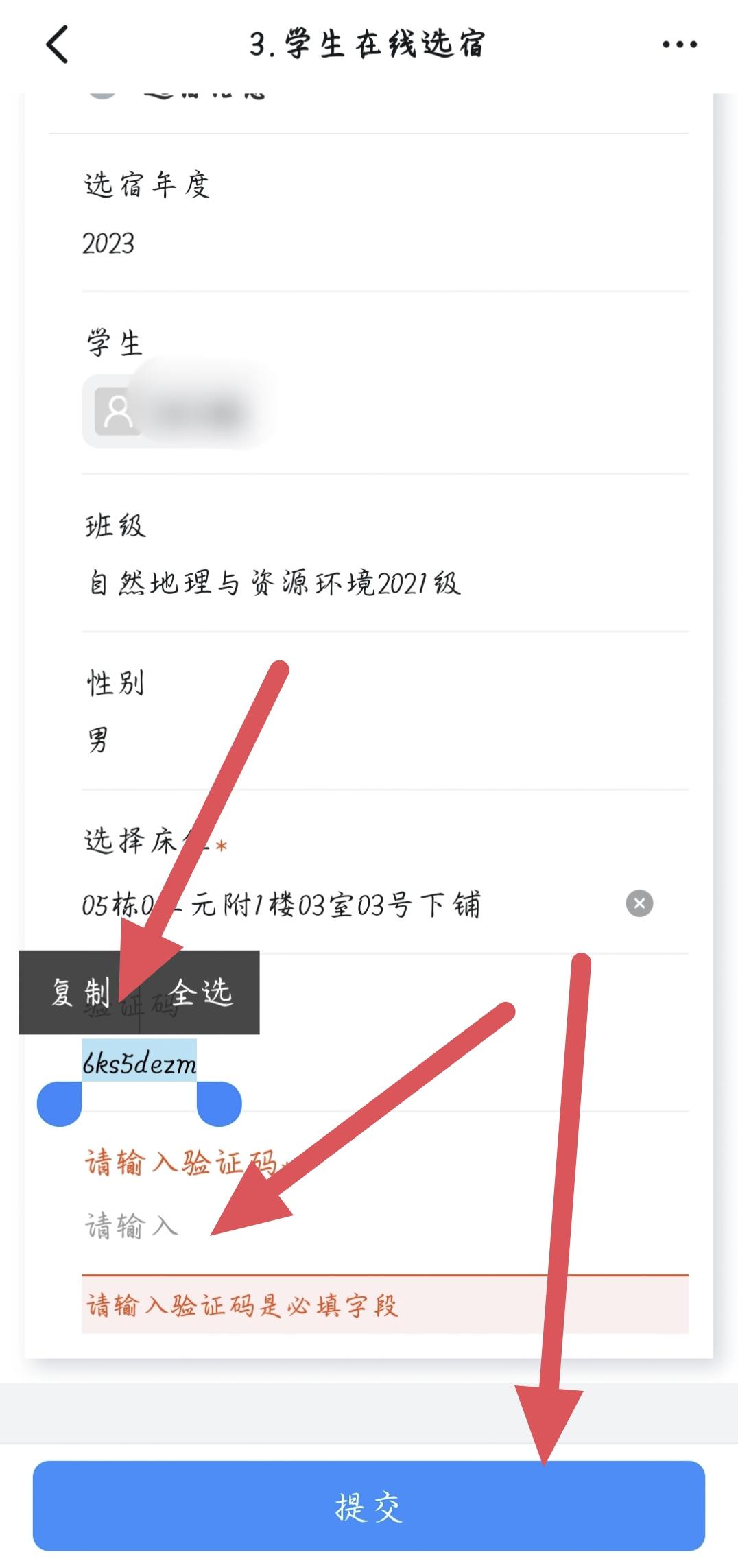 第四步:复制粘贴或者输入验证码后提交选宿信息,将界面中的验证码复制粘贴或者输入,最后点击提交。