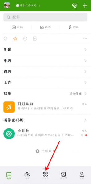 第一步:打开手机钉钉,进入主页后点击下方工作台,进入工作台界面。