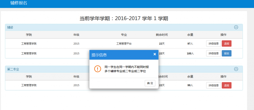 注意事项:学生只能申请一个辅修专业,之前如果有报名的情况下,不能重复报名。